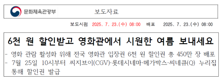 오늘(7월 25일) 오전 10시부터 영화 관람료 6,000원 할인권이 CGV·메가박스·롯데시네마·씨네큐 앱과 홈페이지에서 선착순 배포됩니다!